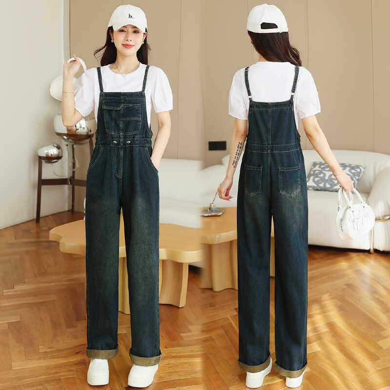复古牛仔背带裤女夏2025新款收腰显瘦宽松直筒吊带连体阔腿裤套装