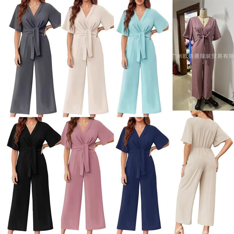 2026春夏欧美跨境女装纯色V领简约设计感短袖连体阔腿裤jumpsuit