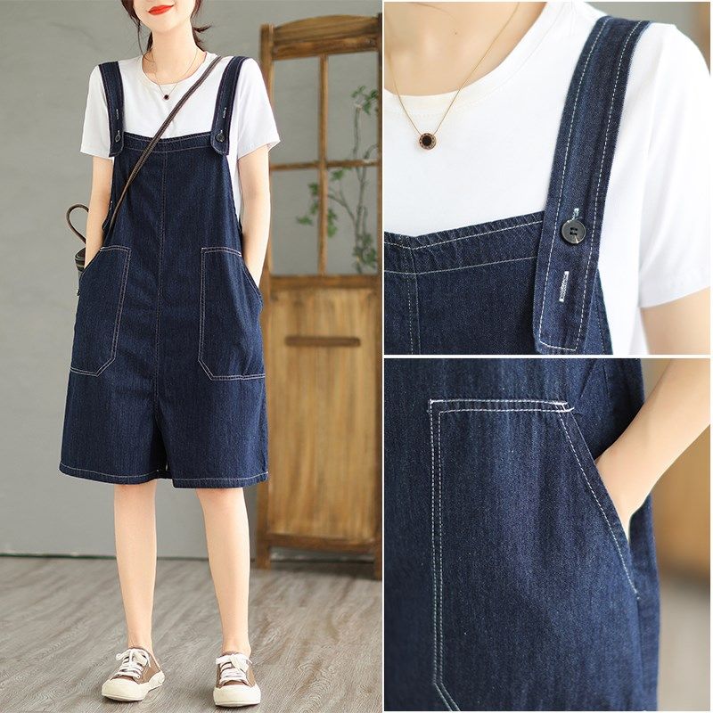 大码胖mm大口袋宽松牛仔背带短裤女夏季显瘦五分裤吊带连体阔腿裤