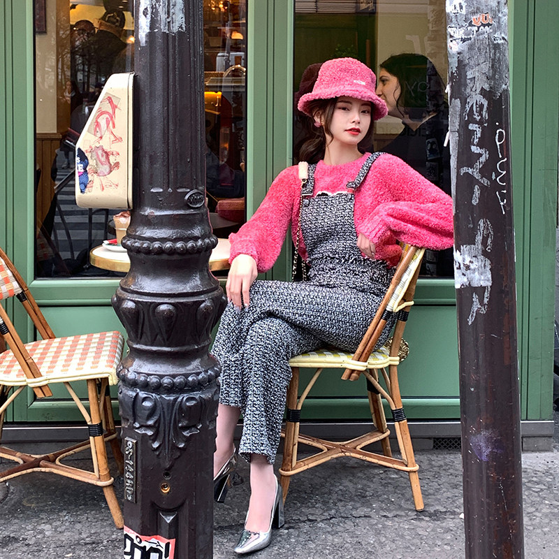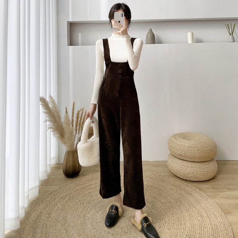 韩版雪尼尔灯芯绒背带裤女小个子秋冬季洋气两件套连体阔腿裤套装