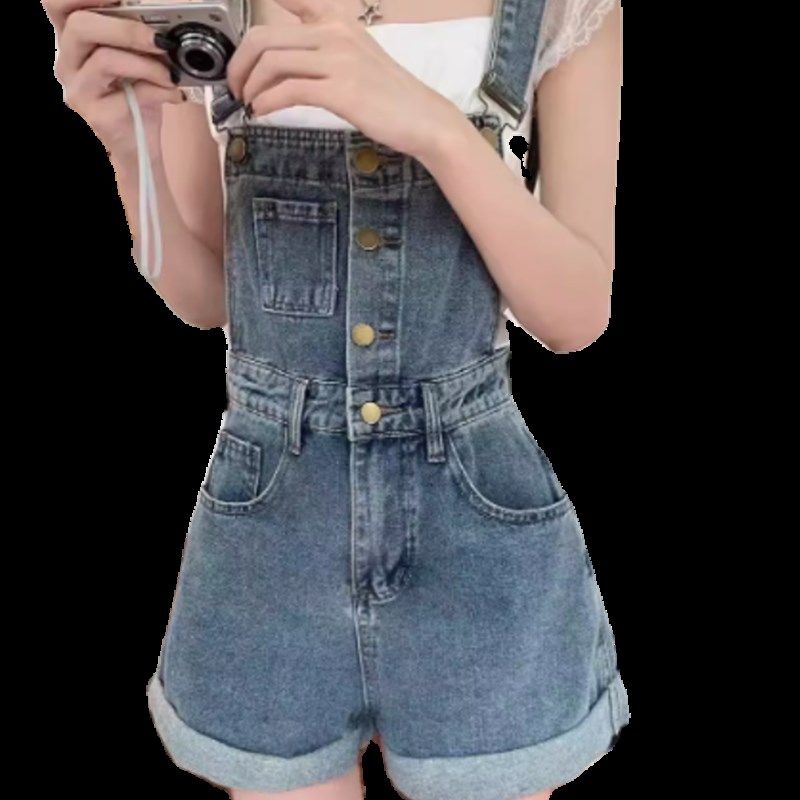 牛仔背带裤女2024夏季新款单排扣卷边短裤小个子高腰连体阔腿裤子