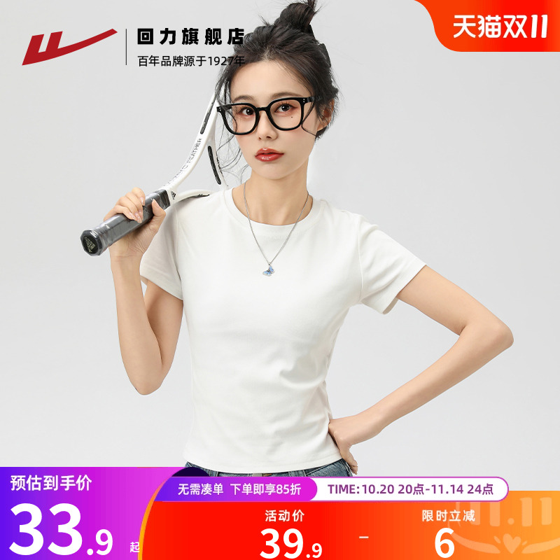 回力正肩短袖t恤女夏季2025新款上衣短款修身纯白色棉体恤打底衫