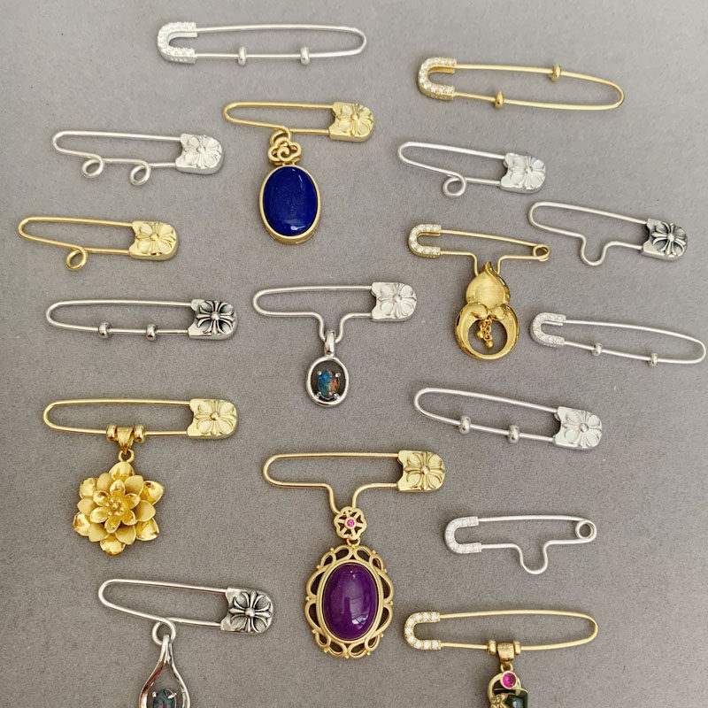 925纯银别针 吊坠变胸针 U形扣带硅胶定位珠 百变万能K金胸针