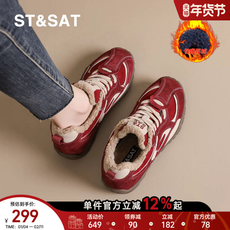 星期六红色鞋子女2025新款秋冬加绒保暖老爹鞋小个子内增高运动鞋