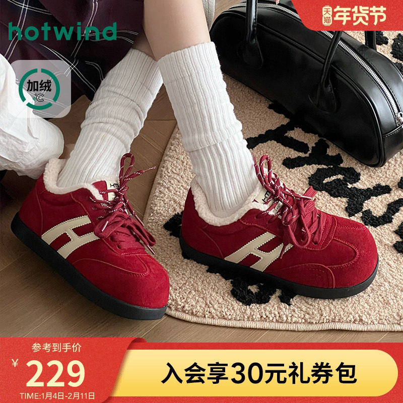 热风红色德训鞋女2025年冬季新款加绒新年休闲鞋百搭女鞋毛毛鞋子