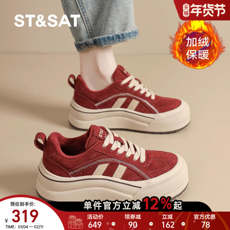 TATA他她乌梅子酱加绒复古德训鞋女红色新年增高厚底板鞋子W9B02