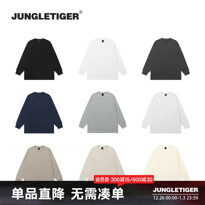 丛林老虎纯色圆领长袖t恤男美式潮牌运动简约宽松白色纯棉打底衫