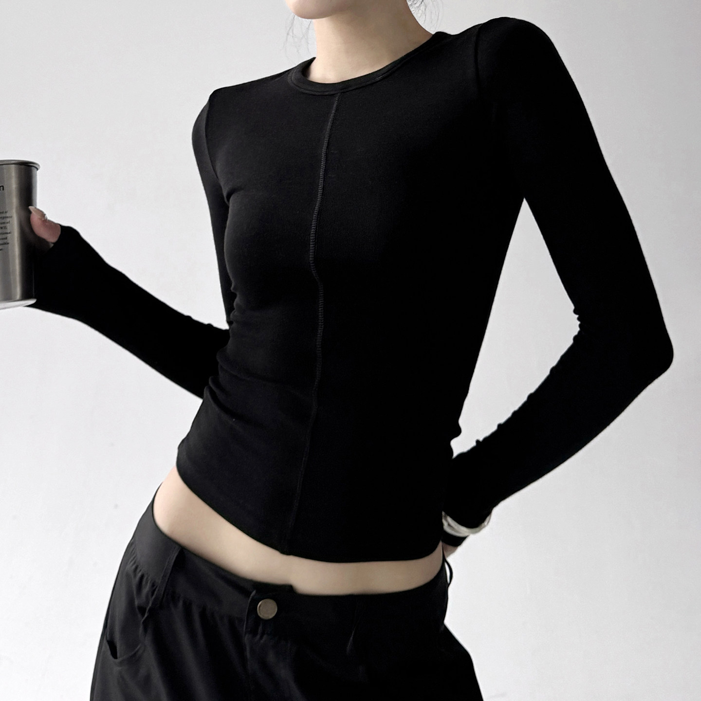 TCCW设计感纯色圆领长袖T恤女秋季新款Best U百搭显瘦打底衫上衣