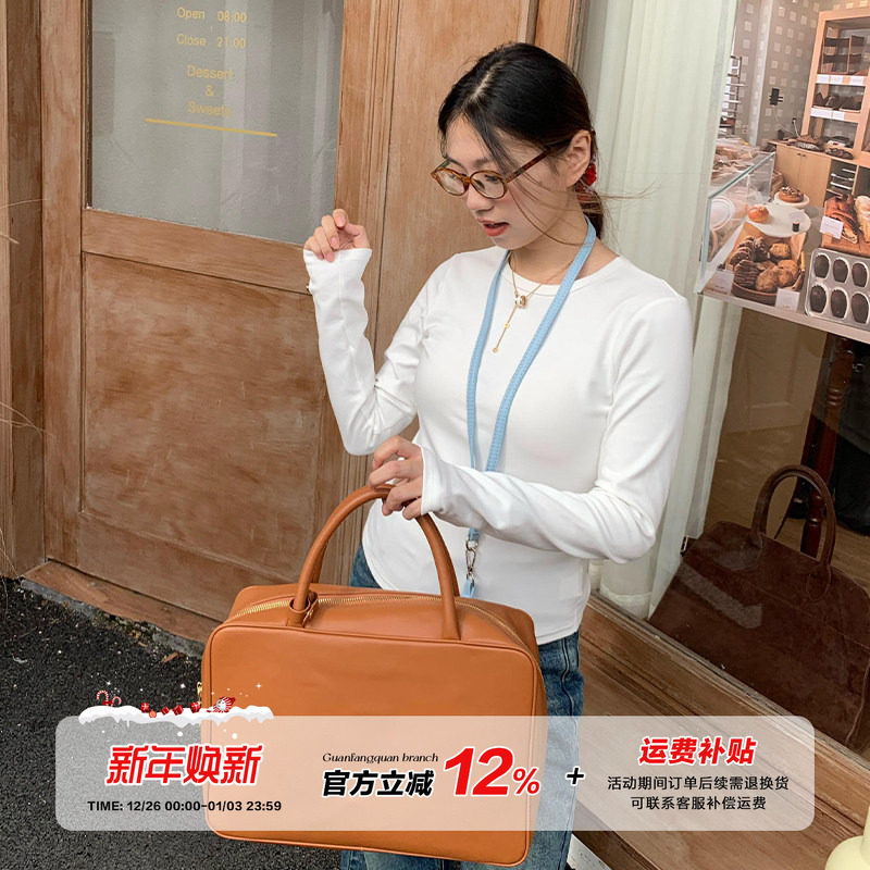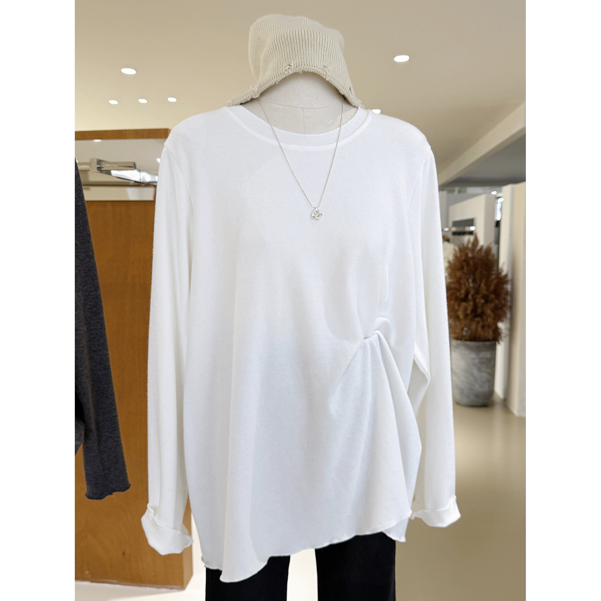 C786软糯糯温柔纯色圆领长袖t恤女春秋内搭设计感打底衫正肩上衣