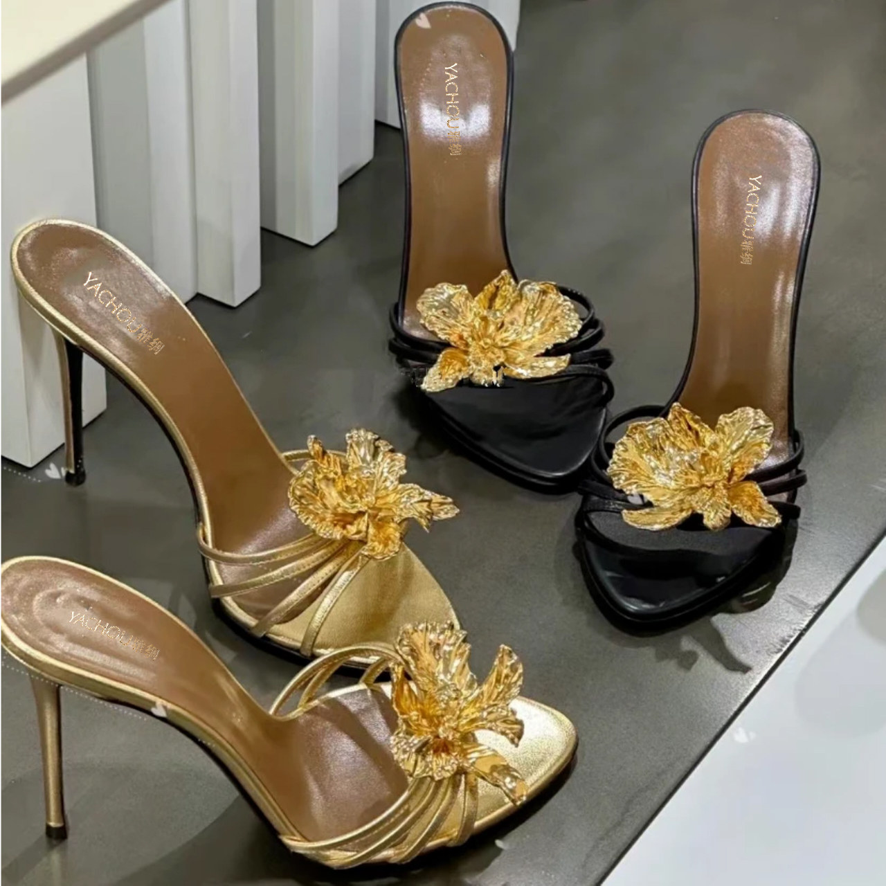 2025年新款夏季金属花朵法式绝美细带凉拖鞋女细跟高跟鞋黑色凉鞋