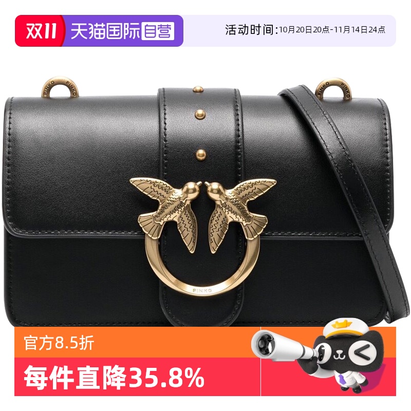 【自营】PINKO经典飞鸟标志链条式肩带牛皮斜挎单肩包女款包黑色