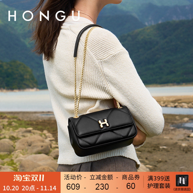 HONGU红谷女包包时尚牛皮经典菱格包链条包单肩包斜挎包时髦方包
