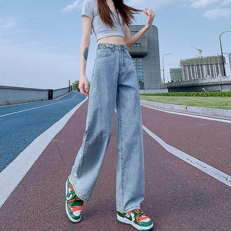 多扣可调牛仔裤女高腰显瘦学生百搭宽松直筒韩版垂感阔腿拖地裤子