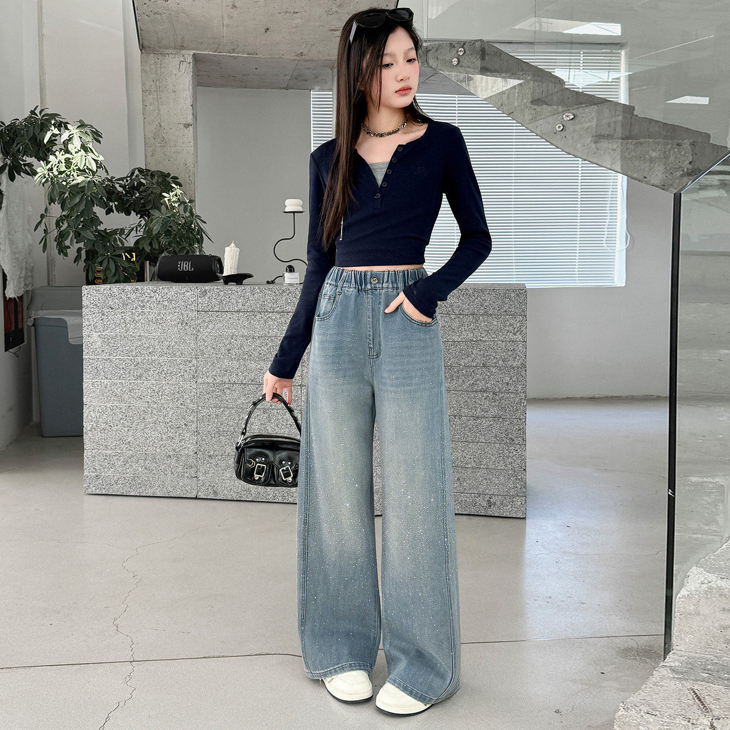 - 牛仔阔腿裤 长裤 高腰
