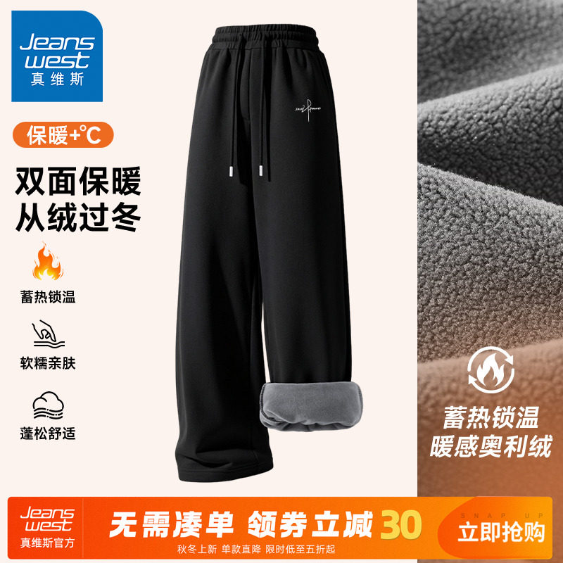 GV真维斯裤子冬装男款黑色加厚奥粒绒直筒裤男加绒保暖宽松卫裤A