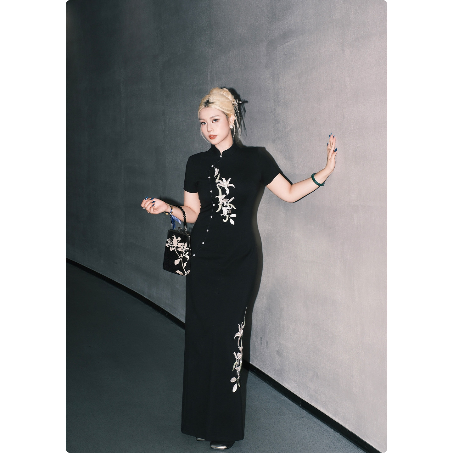 糯米子[晚来香]新中式改良旗袍女夏季重工刺绣国风显瘦黑色连衣裙