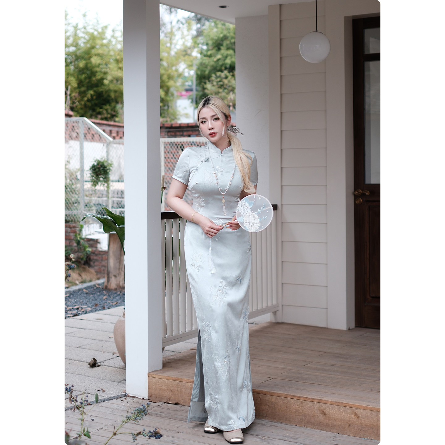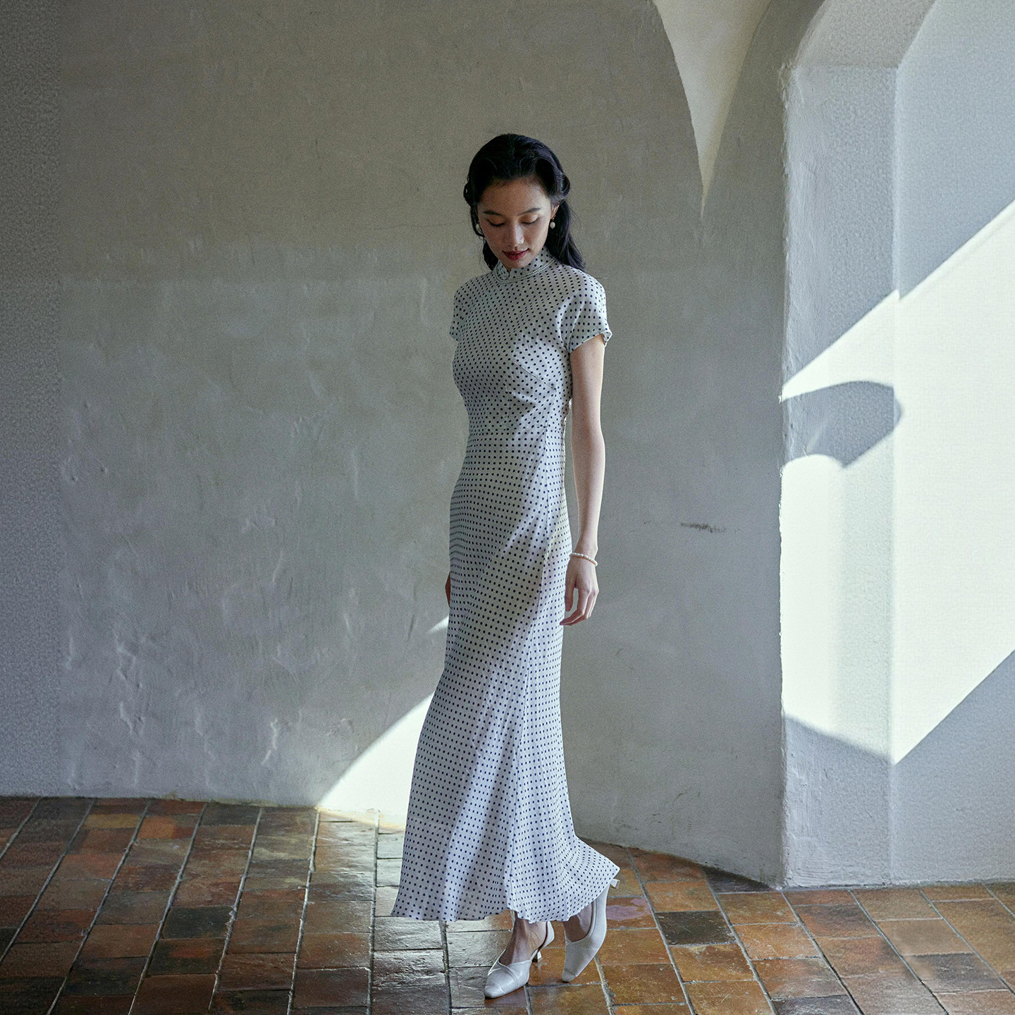 茉茉旗袍春新 短袖有省侧拉链 复古日常鱼尾摆旗袍式连衣裙 雪莲