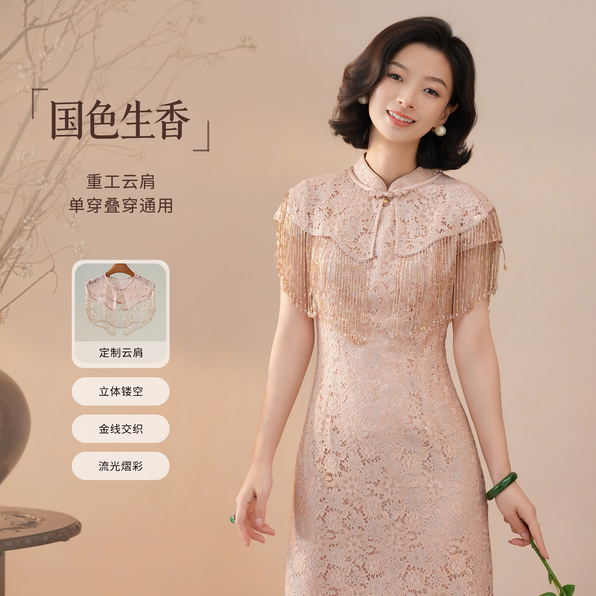 西子/【国色生香】原创重工云肩蕾丝无袖改良旗袍连衣裙/CQTJ539