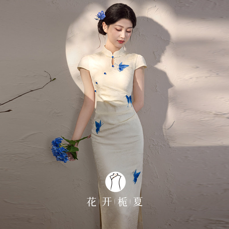 2026夏季新款新中式复古暗纹刺绣蝴蝶收腰显瘦开衩旗袍连衣裙