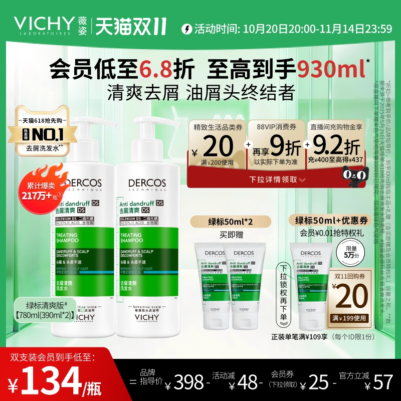 薇姿绿标洗发水官方正品去屑水润控油蓬松二硫化硒洗头膏露男女士