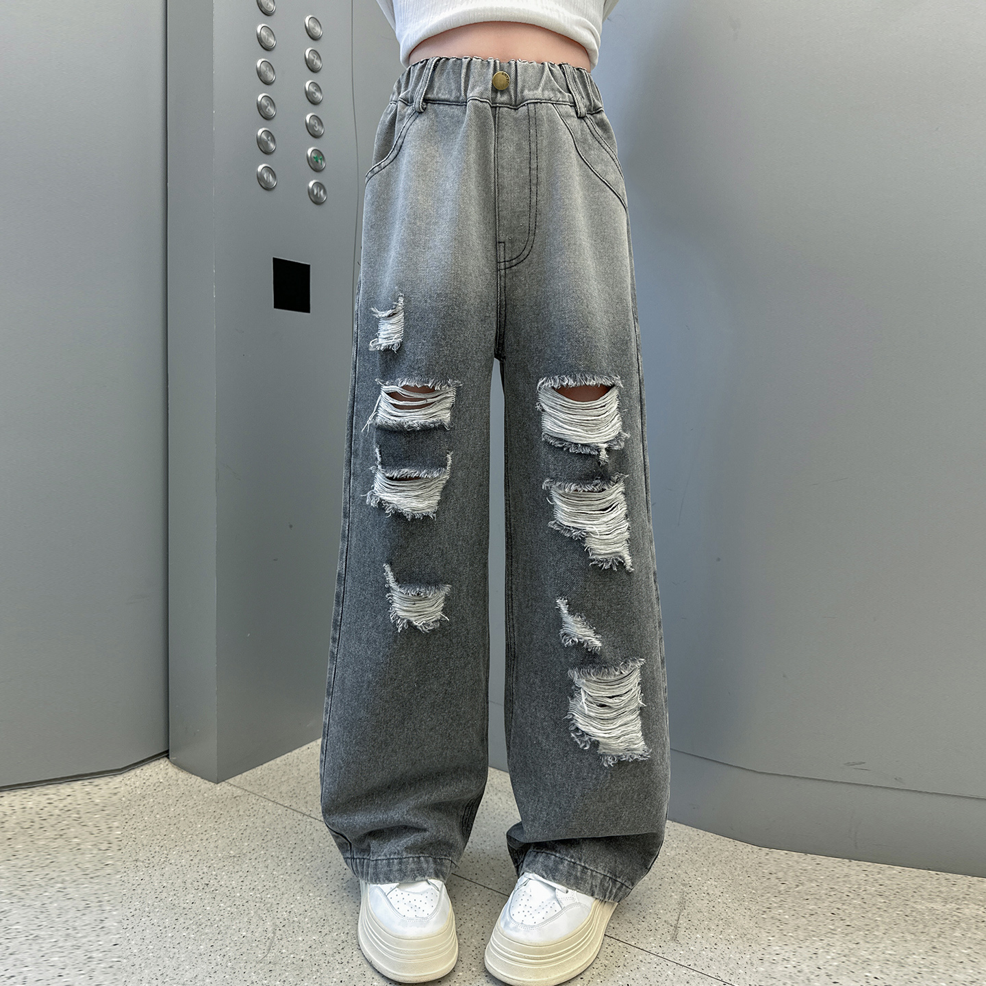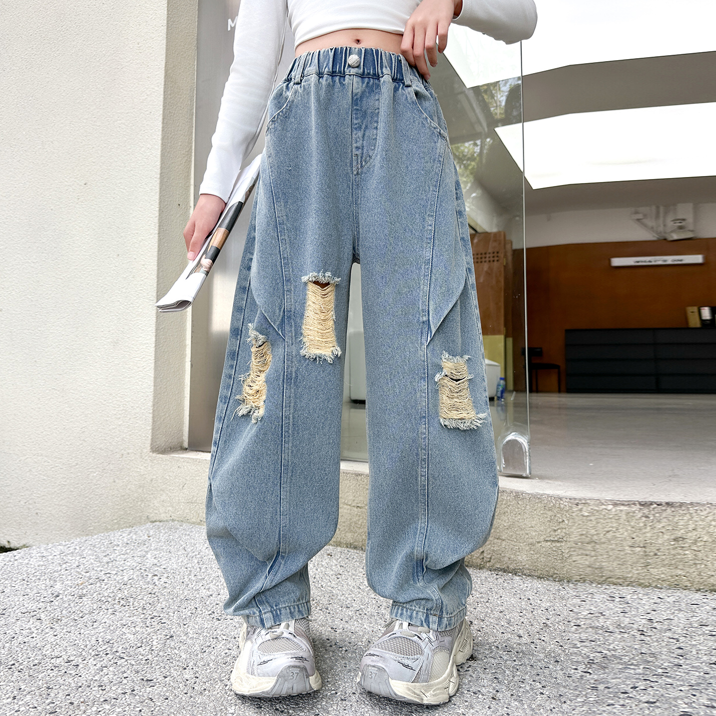 跨境女童大破洞牛仔裤2025秋装新款港风中大童乞丐裤直筒老爹裤子
