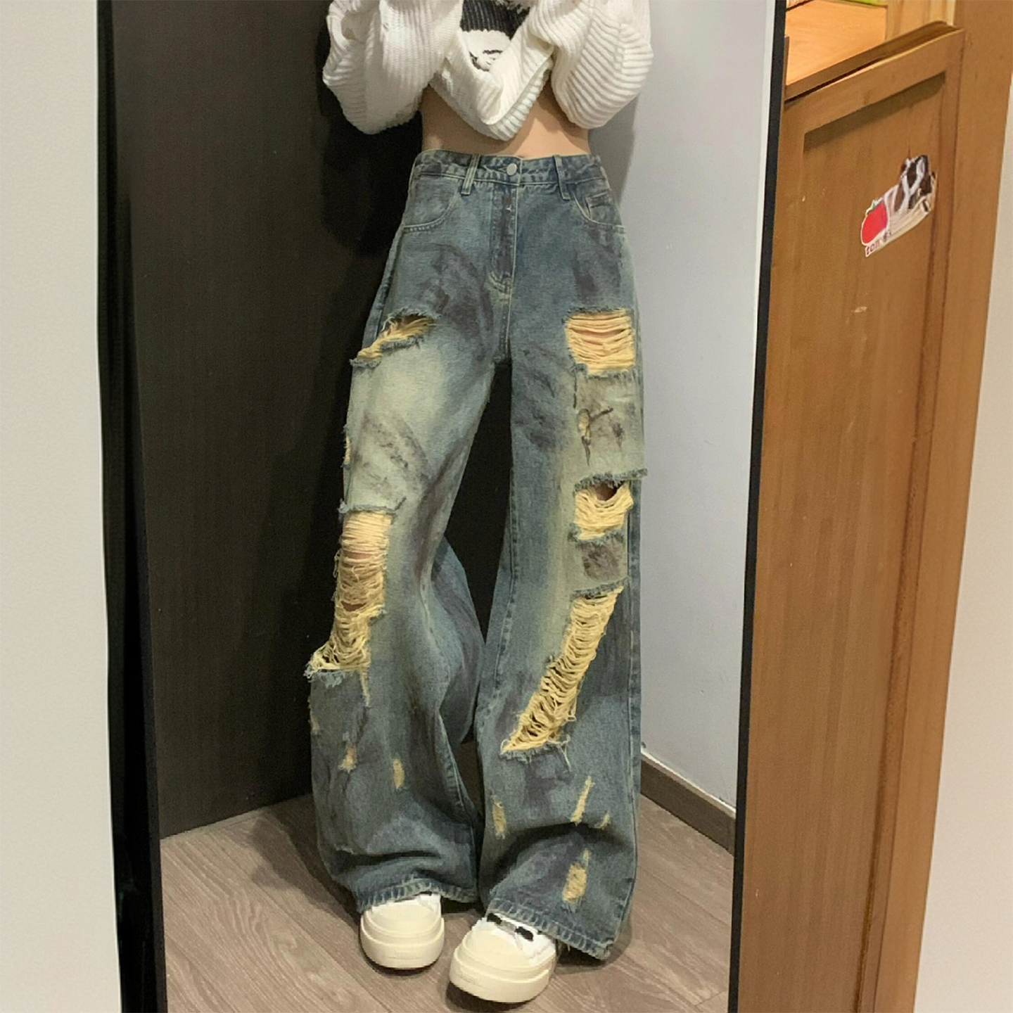 中大童牛仔裤女美式复古做旧字母涂鸦设计vibe个性潮牌破洞乞丐裤