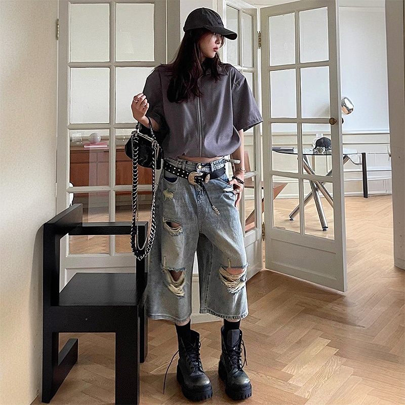 300斤大码美式街头破洞乞丐裤牛仔七分裤女胖mm复古阔腿过膝短裤