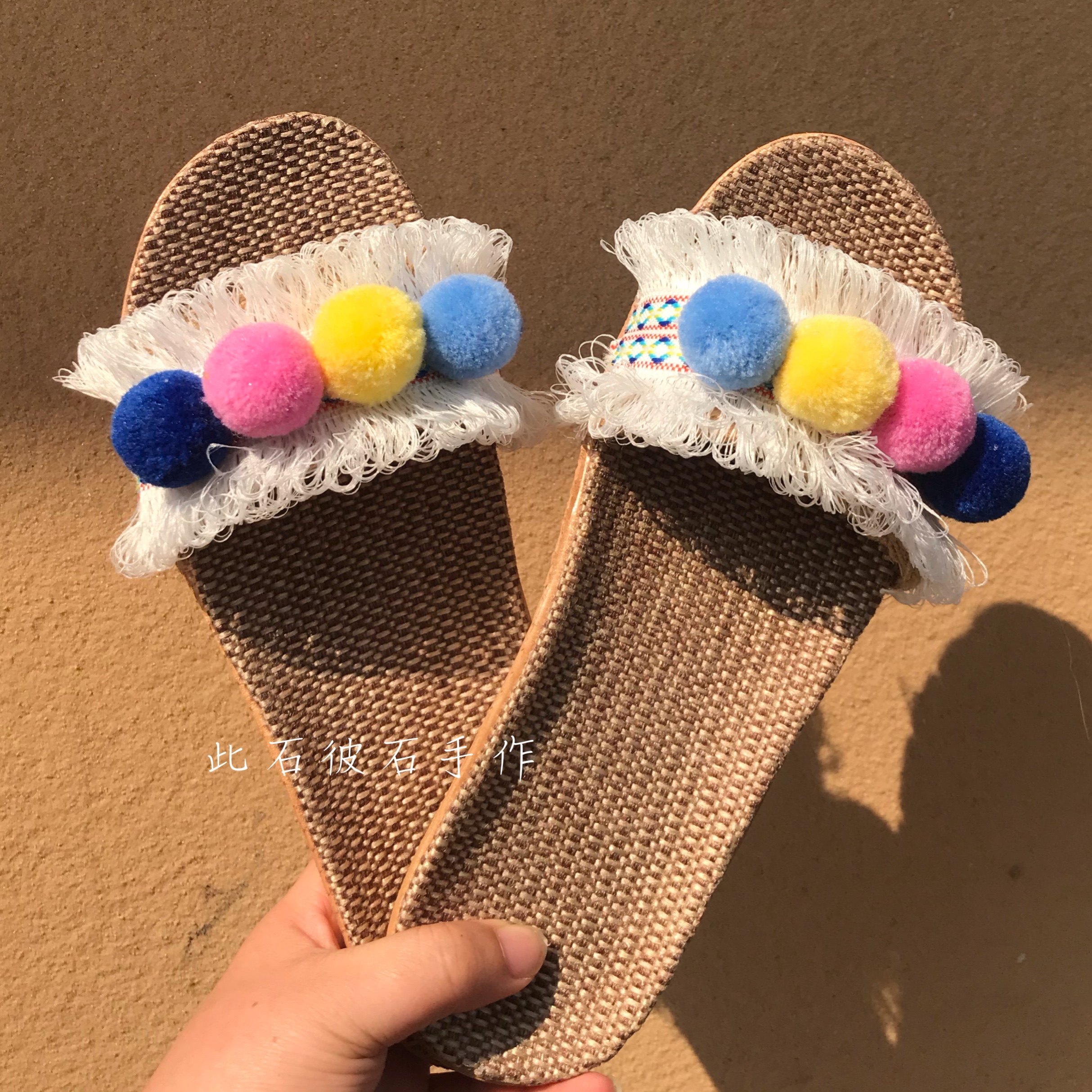 春秋ins风浅口流苏毛球格纹布艺居家防滑软底静音木地板家用拖鞋