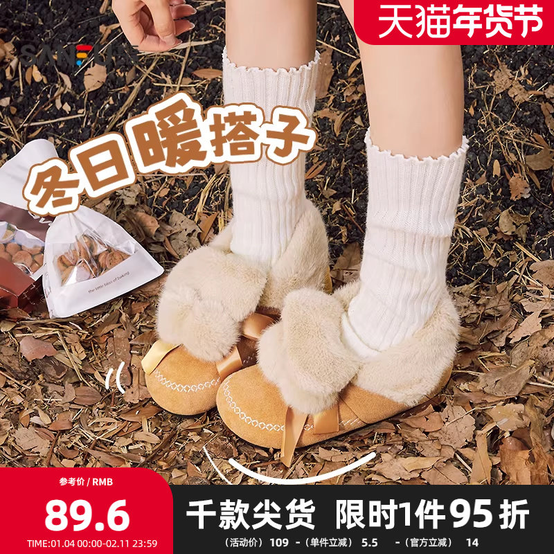 三福女毛毛鞋冬季丑萌绒心可爱双毛球圆头雪地靴女鞋848504