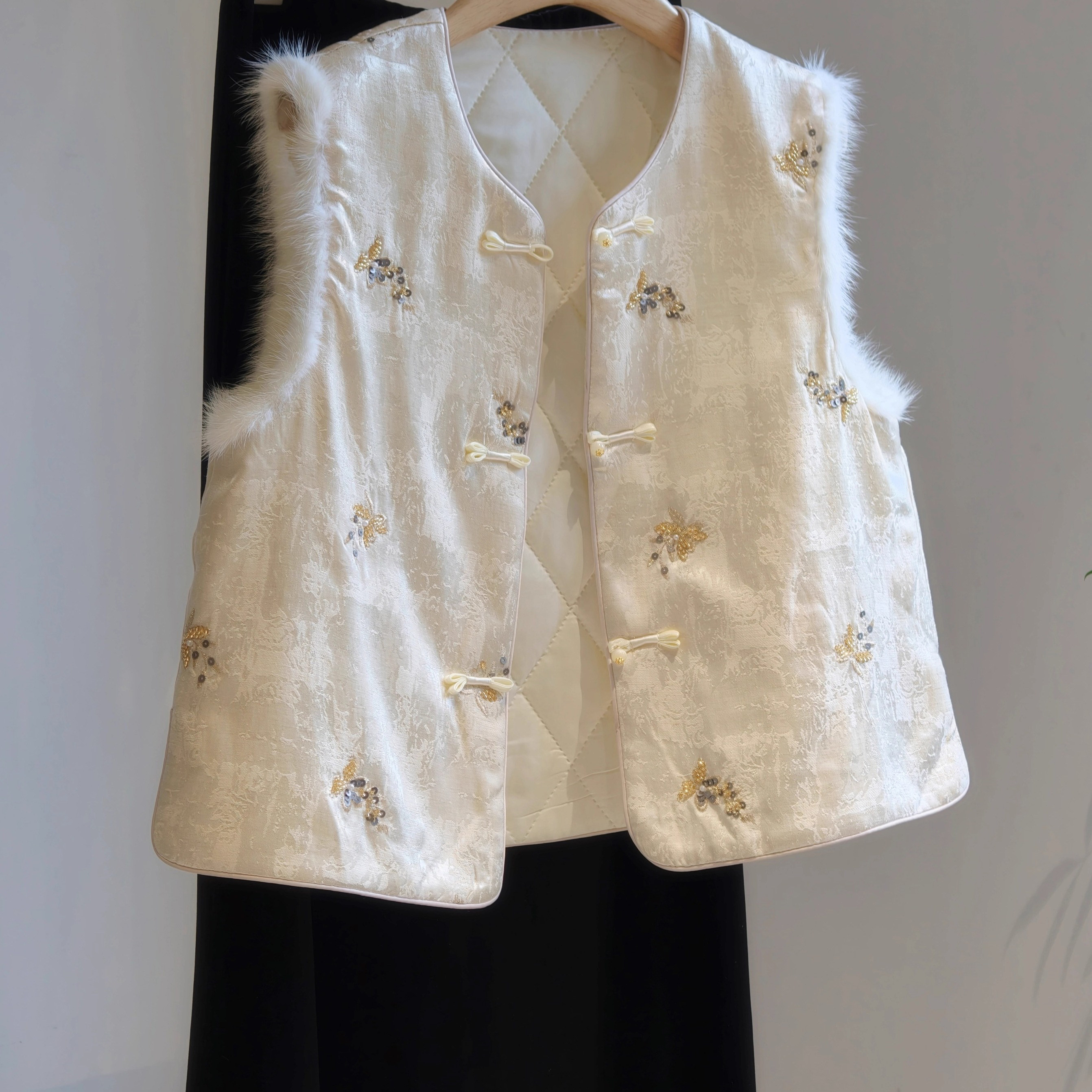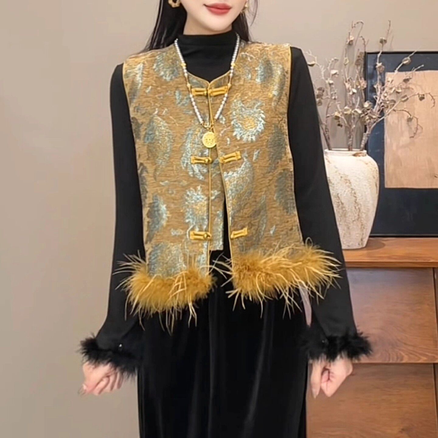 新中式重工复古马夹C时尚圆领盘扣短款加厚马甲毛毛拼接国风女装