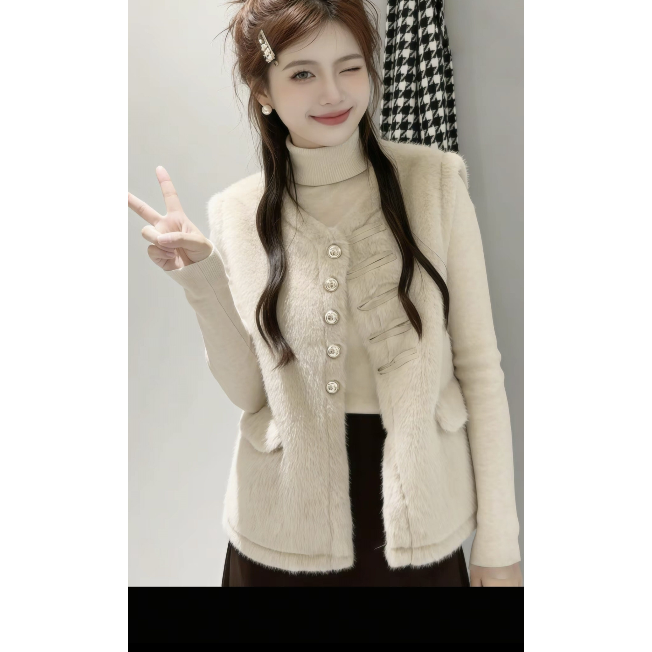 2025年秋冬新款韩版时尚高级感皮扣子毛毛马甲女短款背心坎肩外套