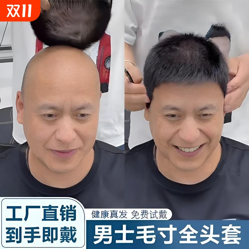 男士假发全真发自然透气款短发全头套中老年遮白发光头专用假发套