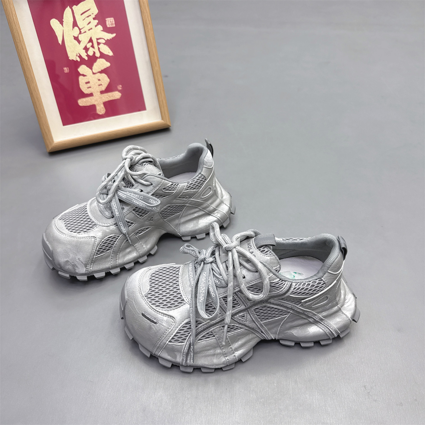 真皮网纱女鞋隐形内增高老爹鞋2026春款韩版系带运动鞋跑步休闲鞋