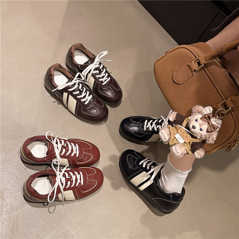韩版穿搭~真皮内增高两杠德训鞋女2025秋季双色带超软休闲运动鞋