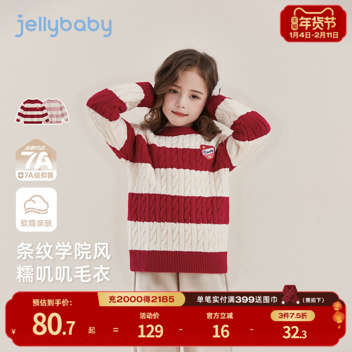 [抗菌远红外]女童毛衣秋冬宝宝条纹圆领春装儿童针织衫女大童上衣
