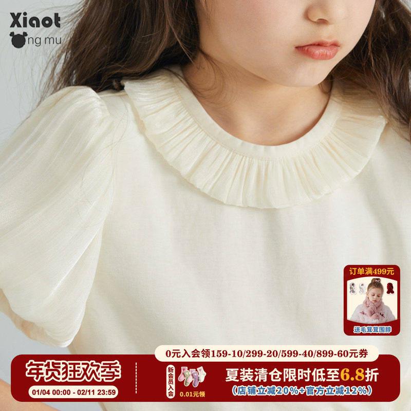小童木 甜美法式女童短袖T恤夏装2025新款网纱泡泡袖女大童上衣