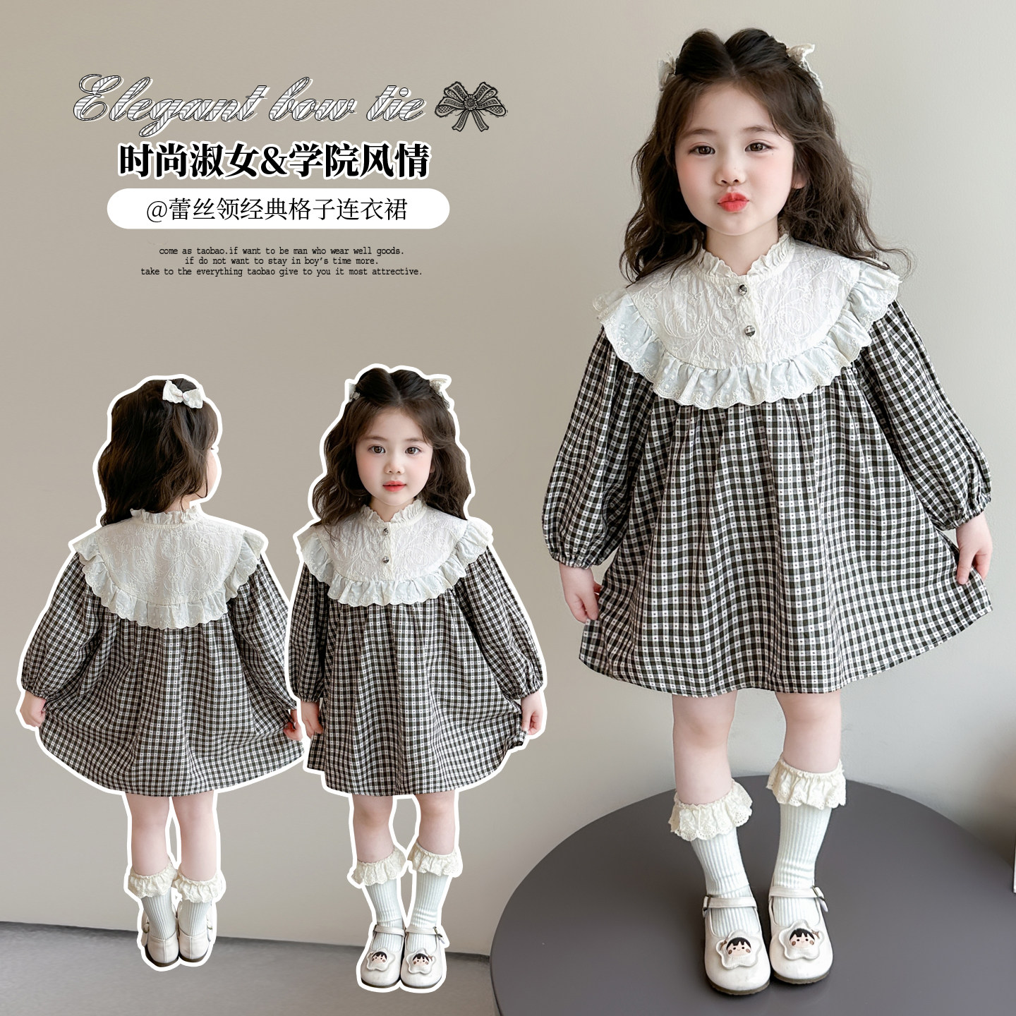 2026韩版时尚女童格子连衣裙春秋新款蕾丝领长袖洋气公主裙中裙