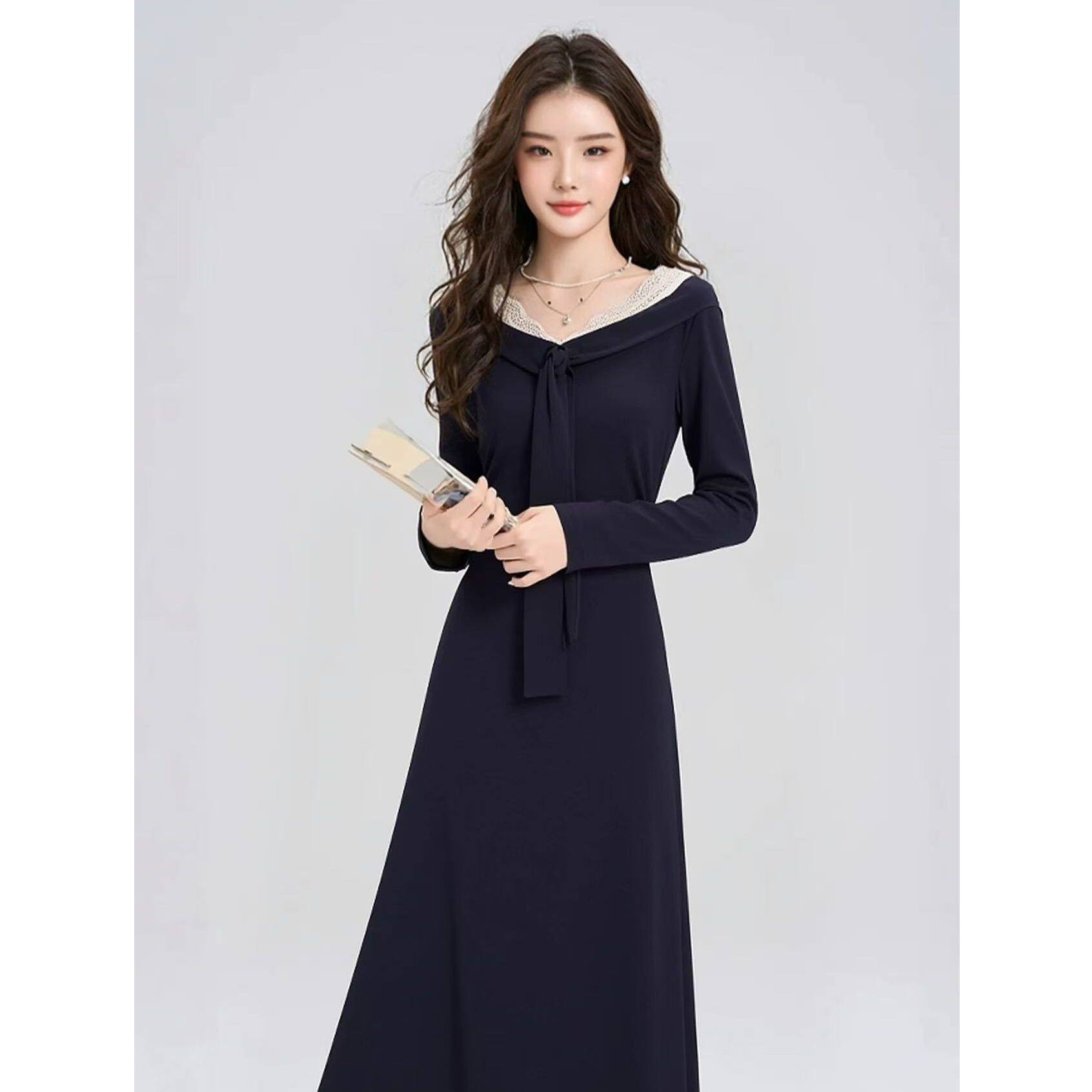 春秋季新款韩版时尚气质显瘦连衣裙女小众蕾丝拼接长袖掐腰长裙子