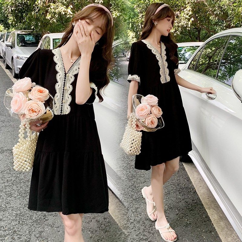 孕妇装夏装时尚蕾丝花边短袖V领连衣裙韩版显瘦裙子夏季孕妇裙夏