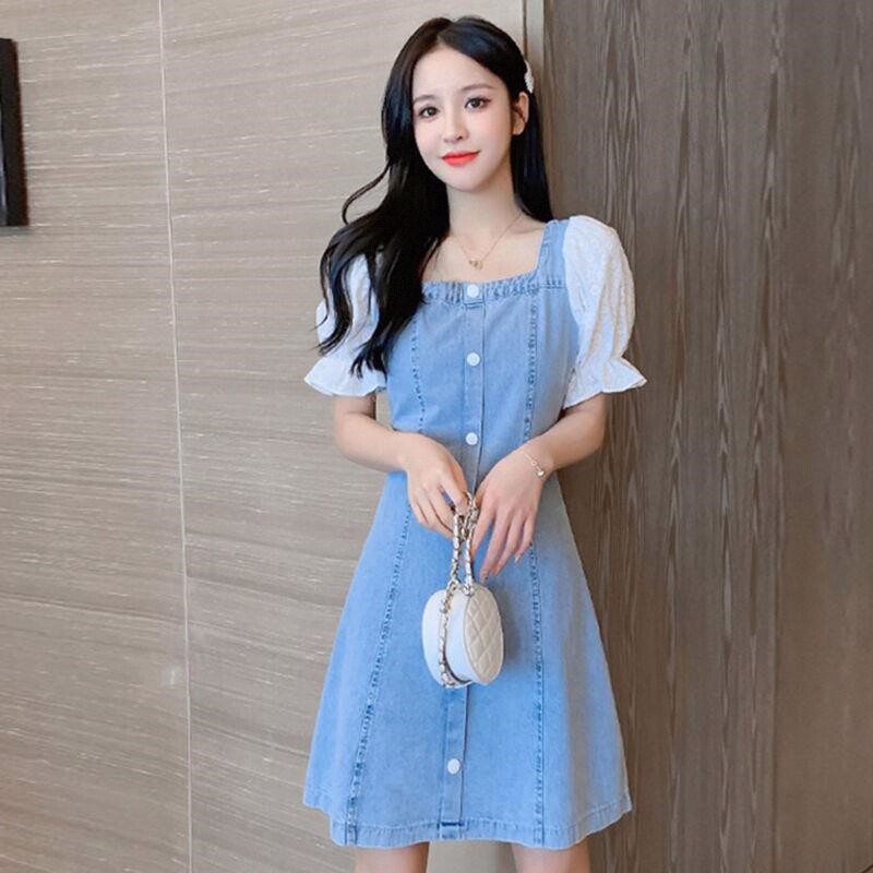 夏季牛仔连衣裙女韩版时尚显瘦蕾丝拼接方领泡泡袖中长款连衣裙女