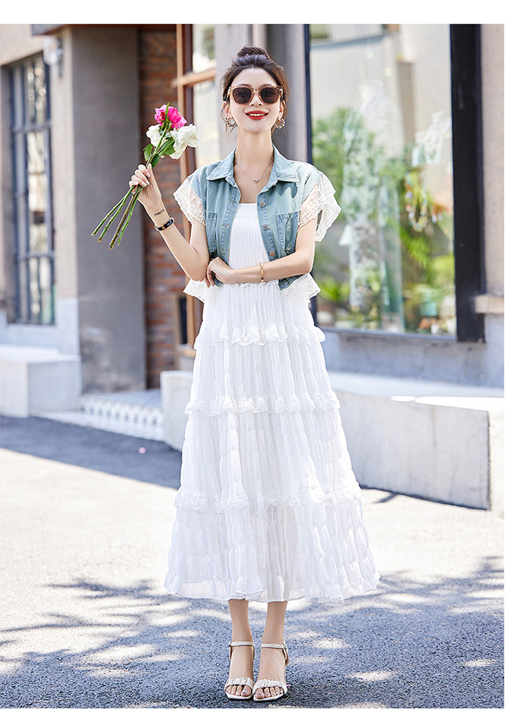 时尚牛仔连衣裙两件套女夏季新款韩版设计感小香风蕾丝吊带蛋糕裙