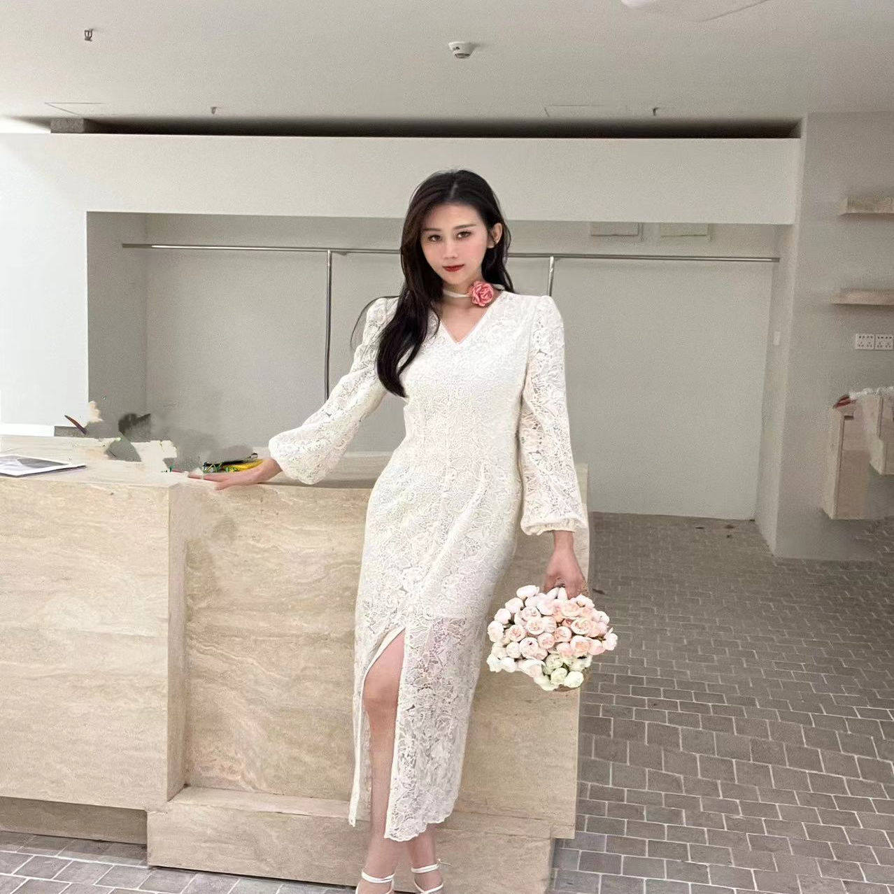 2026夏新款韩版时尚v领鱼尾旗袍长裙子蕾丝高腰连衣裙女时尚修身