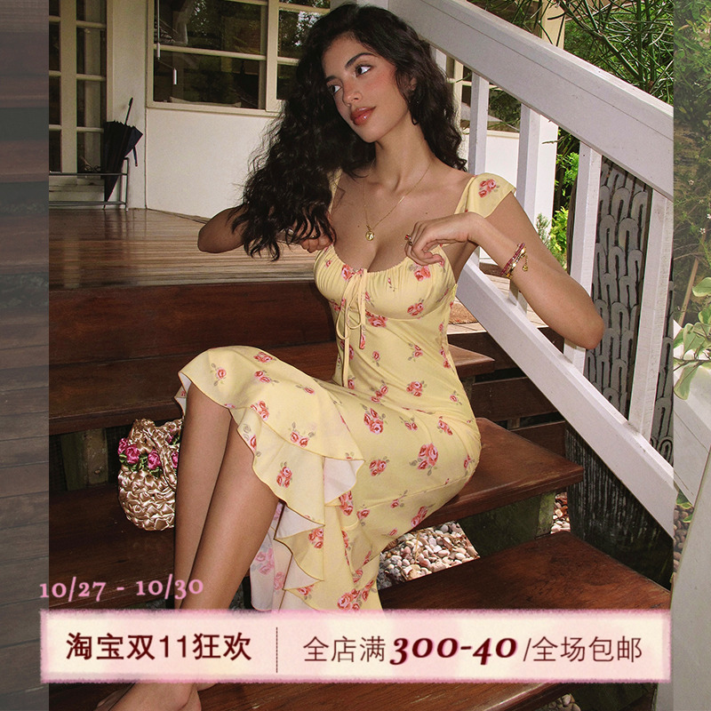 ITSNIKAR【獨家印花】法式碎花吊带连衣裙女夏荷叶边设计鱼尾裙子