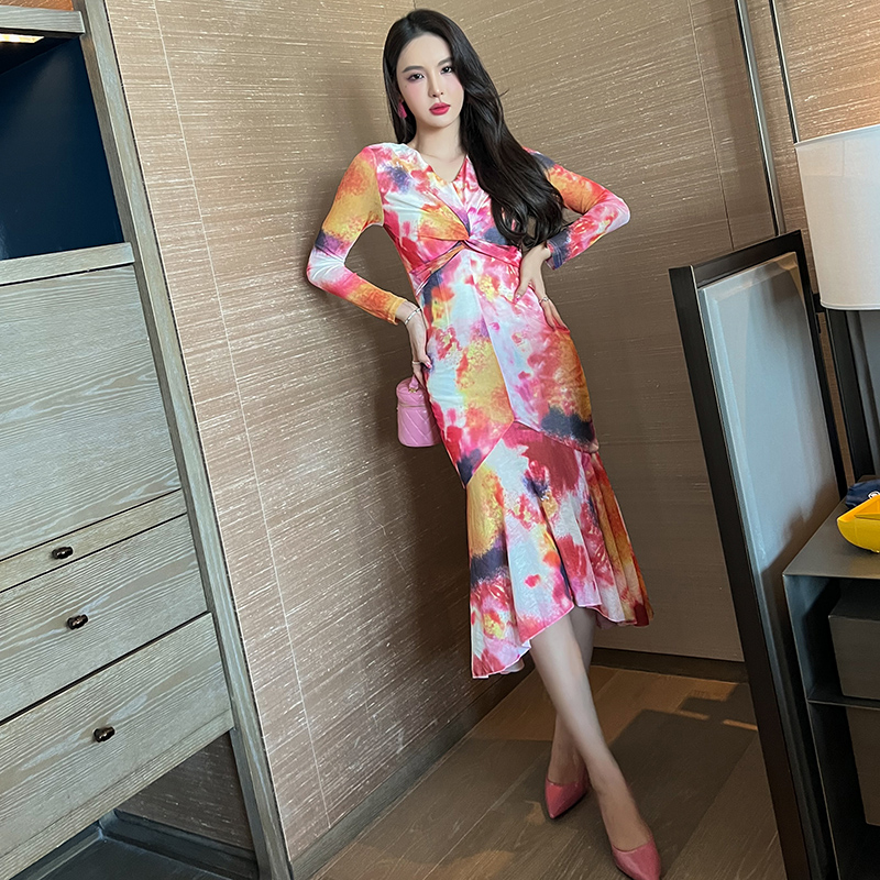 花色别致荷叶边连衣裙秋季新款优雅温柔气质收腰显瘦包臀鱼尾裙女