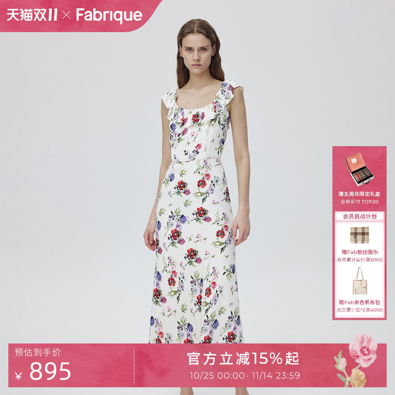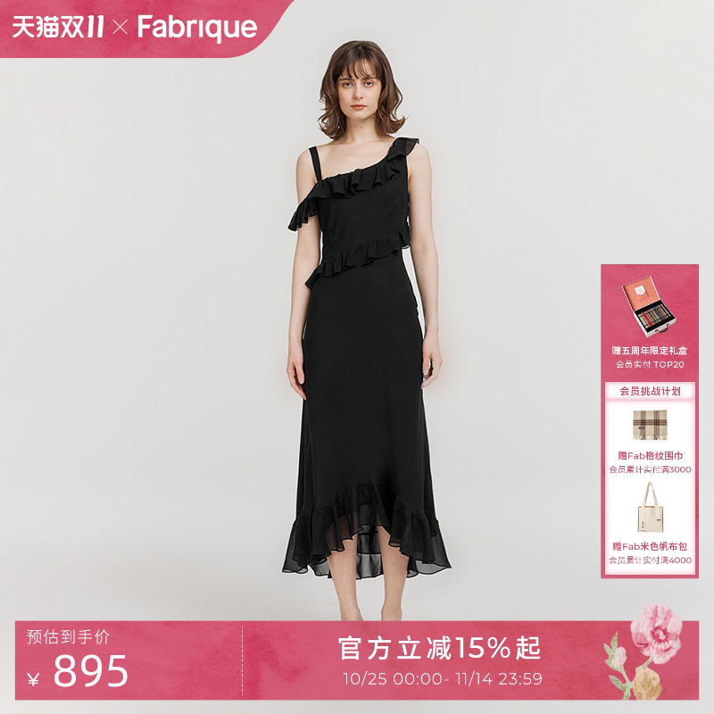 Fabrique桑蚕丝不对称荷叶边真丝连衣裙女夏季新品吊带鱼尾裙