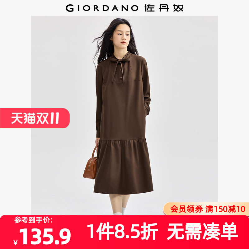 佐丹奴裙子女装磨毛领带荷叶边小立领梭织鱼尾连衣裙 05464710
