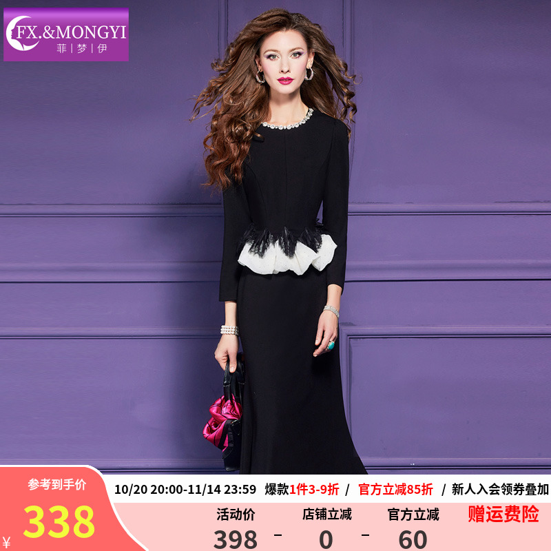 菲梦伊原创黑色西装连衣裙女秋季轻熟荷叶边收腰气质假两件鱼尾裙