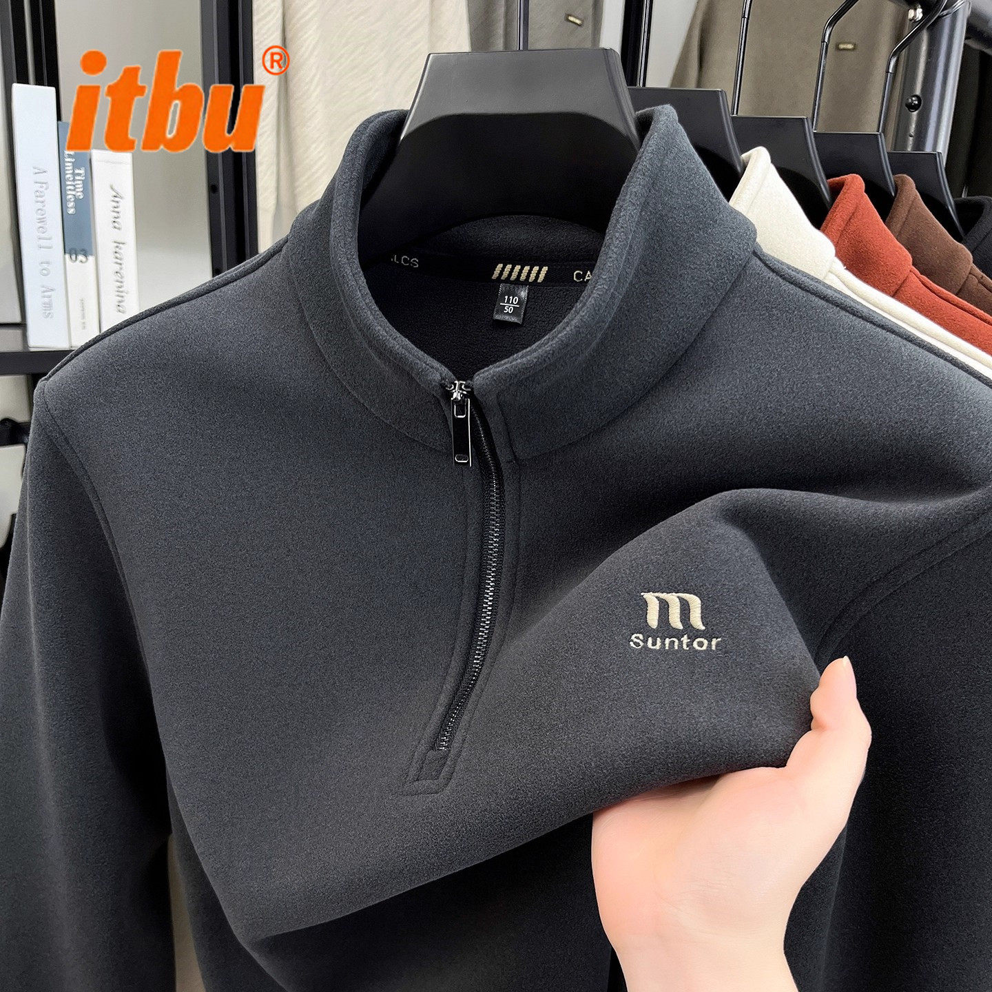秋冬新款加绒肌理立领卫衣男半拉链简约纯色百搭宽松长袖休闲上衣