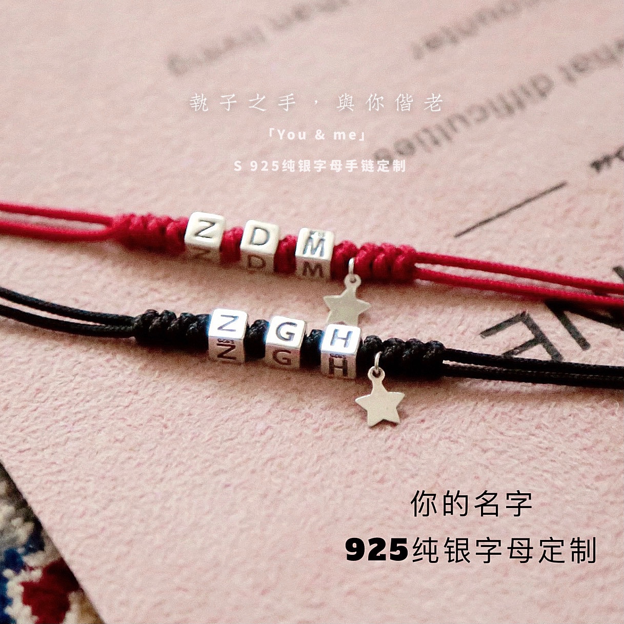 s925纯银字母手链moree手绳情侣款 一对你的名字手绳编织红绳礼物