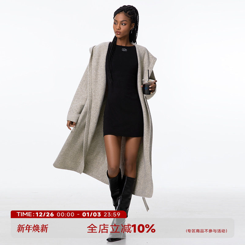 ABMY 第十四行诗 高克重连帽羊毛开衫女秋冬慵懒加厚长款毛衣外套